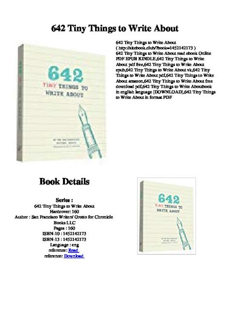 642 tiny things to write about Kindle Editon By Click Button. 642 tiny things to write about it’s easy to recommend a new book category such as Novel, journal, comic, magazin, ect. You see it and you just know that the designer is also an author and understands the challenges involved with having a good book. You can easy klick for detailing book and you can read it online, even you can download it
